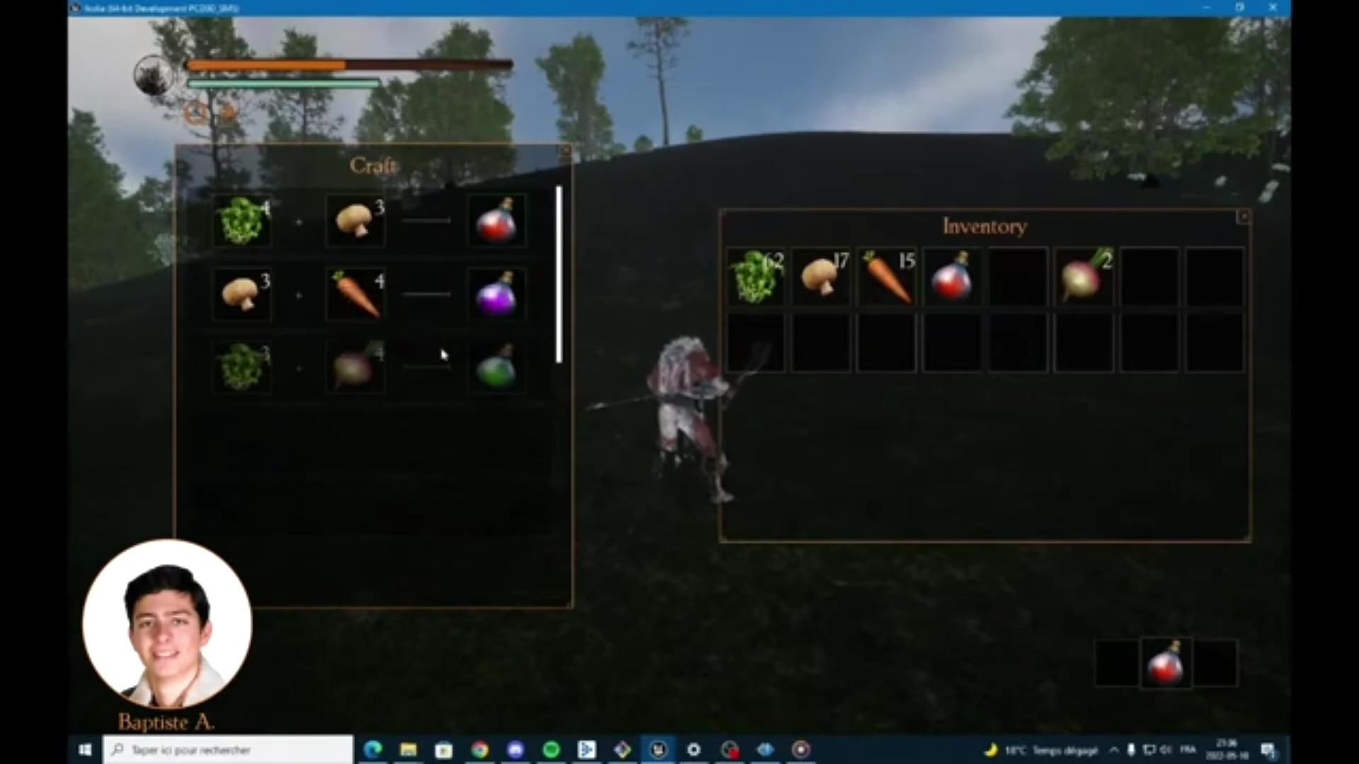 Création d'un système d'inventaire que peut utiliser le joueur pour stocker sous forme de stack des items trouvables sur l'île. Gestion de l'aspect visuel et fonctionnel.